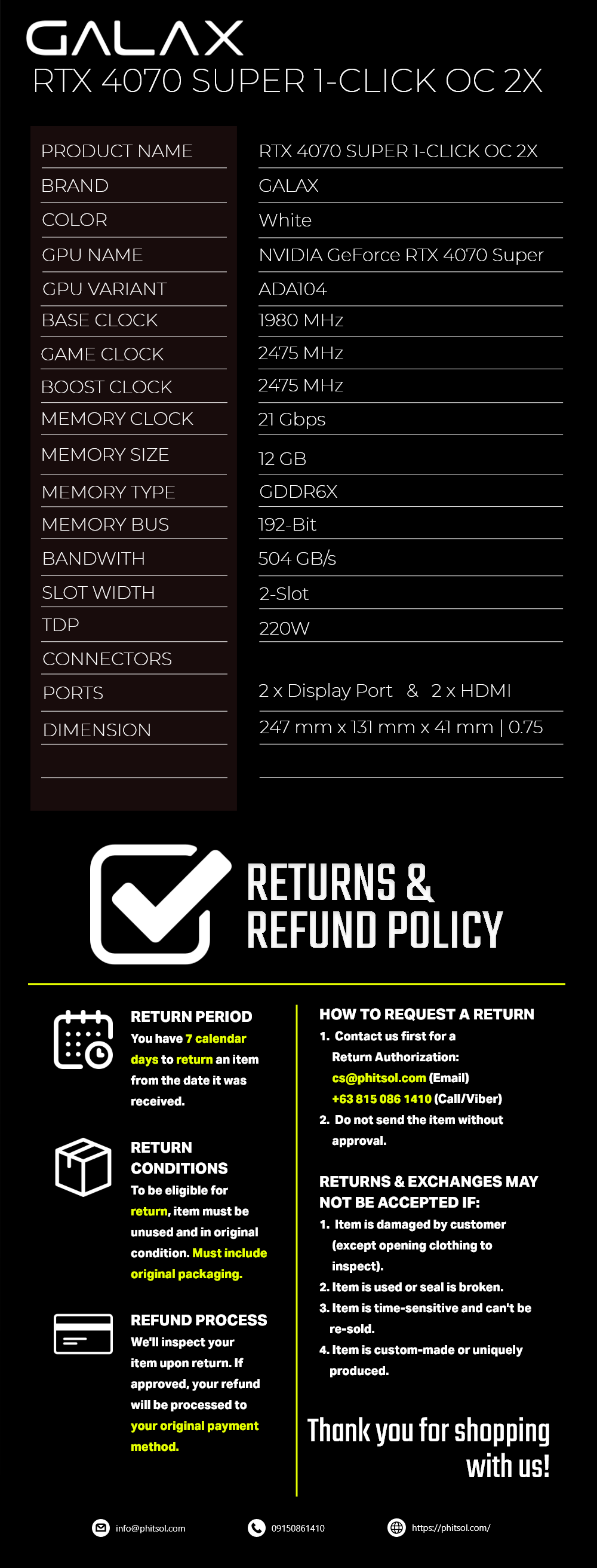 GALAX RTX 4070 SUPER 1-CLICK OC 2X | 12GB GDDR6X | 192-BIT | 12-PIN | DISPLAY PORT x 2 | HDMI x 2 (SLIGHTLY USED)